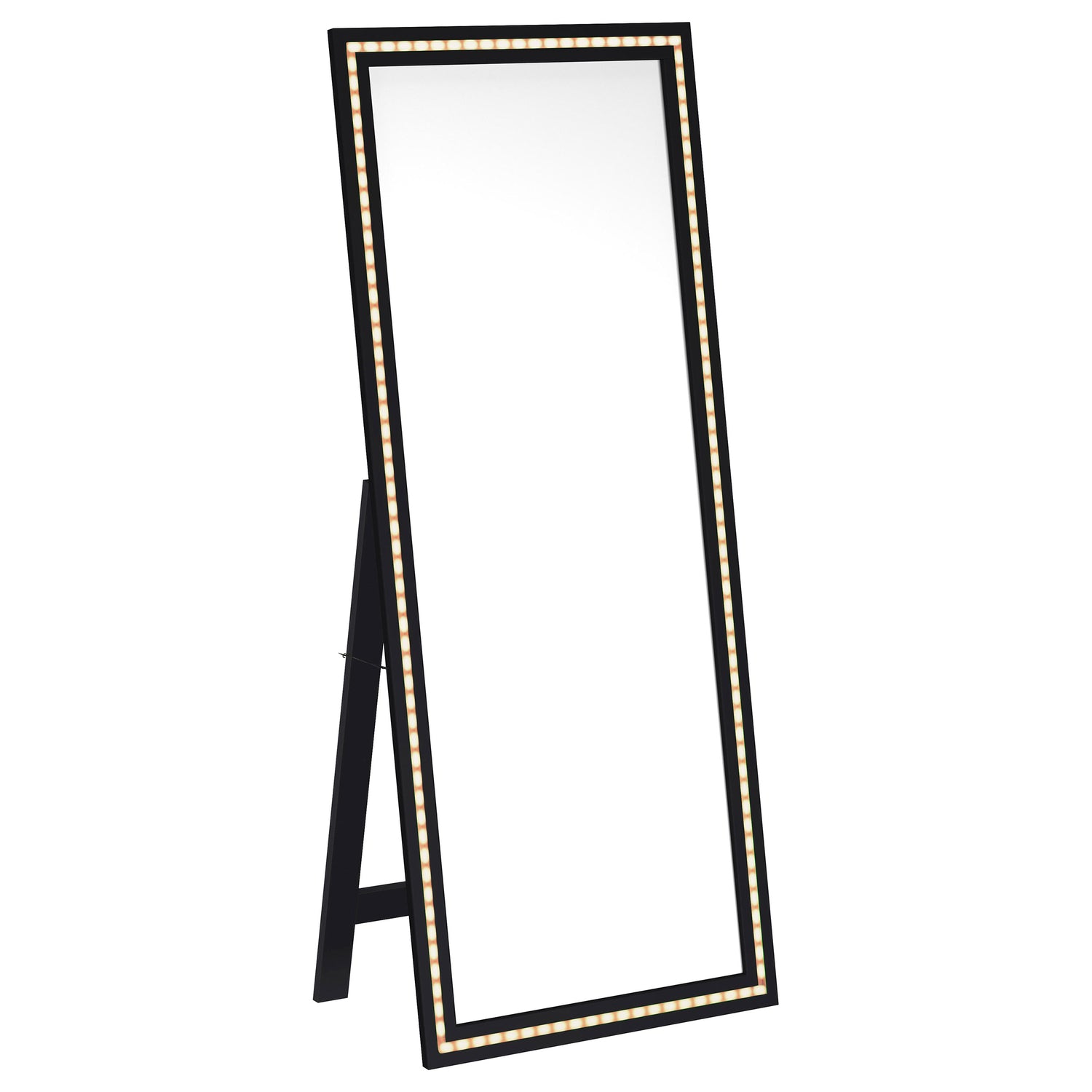 Dress up a dressing area or seating group with the glamour of a modern floor mirror. The full length design features a decorative frame complete with a support leg or its freestanding, perfect for defining an open living space or offering dimension elsewhere in your home. The mirror includes LED lighting, creating an inviting ambiance while providing light perfect for selecting jewelry or choosing your outfit. It features a neutral finish with silver trim that gleams in the light, creating a sense of depth and dimension. Choose the perfect spot for this freestanding floor mirror.