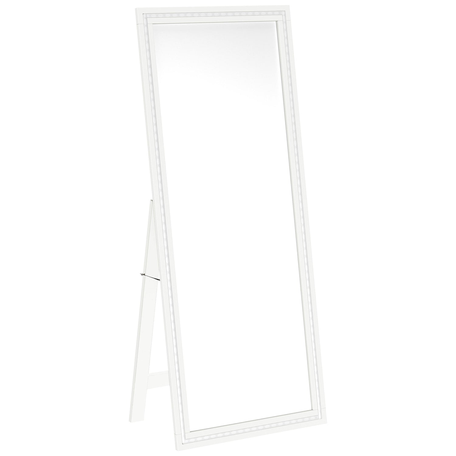 Dress up a dressing area or seating group with the glamour of a modern floor mirror. The full length design features a decorative frame complete with a support leg or its freestanding, perfect for defining an open living space or offering dimension elsewhere in your home. The mirror includes LED lighting, creating an inviting ambiance while providing light perfect for selecting jewelry or choosing your outfit. It features a neutral finish with silver trim that gleams in the light, creating a sense of depth and dimension. Choose the perfect spot for this freestanding floor mirror.