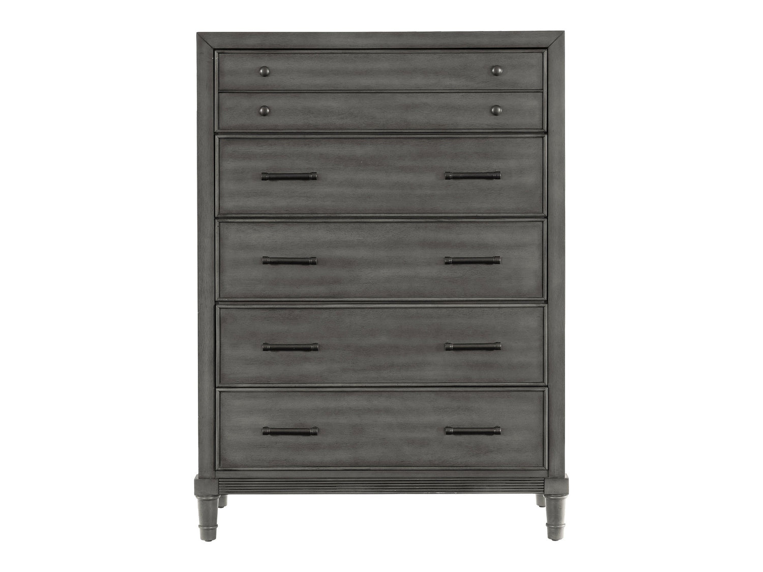 Modern convenience is paired with transitional style to create the versatile look of the Wittenberry Collection. The chest’s gray finish over okume veneer is complemented by the dark bronze finished knob and bar hardware that fronts the framed drawers of the piece.
