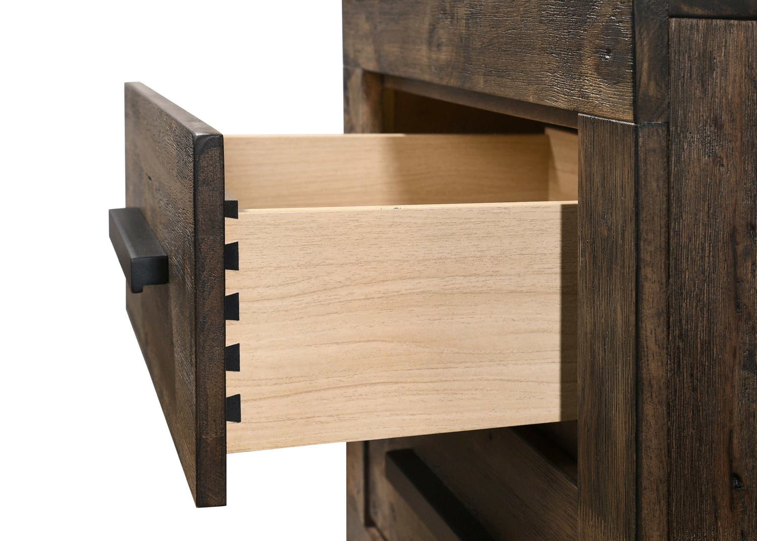 Update a bedroom with strong, stately elegance. Featuring solid hardwood construction, this classic nightstand is a stylish and durable choice. A full matte finish with wire brushed detail gives it a rich, rustic vibe. Wooden handles and thick block feet add a rugged element to its masculine design. Equipped with two generous, slide-out drawers, this wooden nightstand gives you all the storage space you need for a neat and organized bedside.
