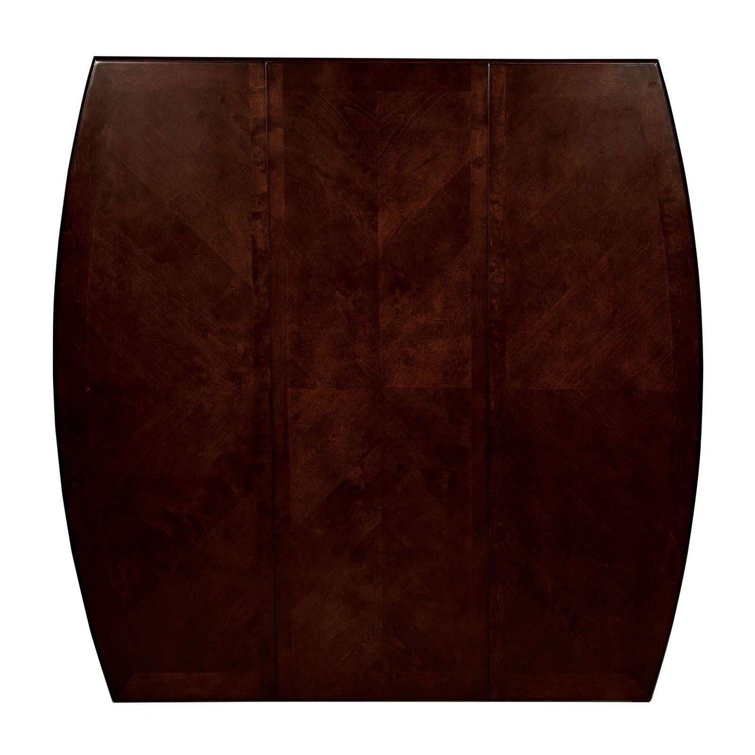 The perfect transitional dining set for any home. Finished in dark cherry, the table has simple yet elegant lines and eight matching chairs with padded leatherette seats and backs.