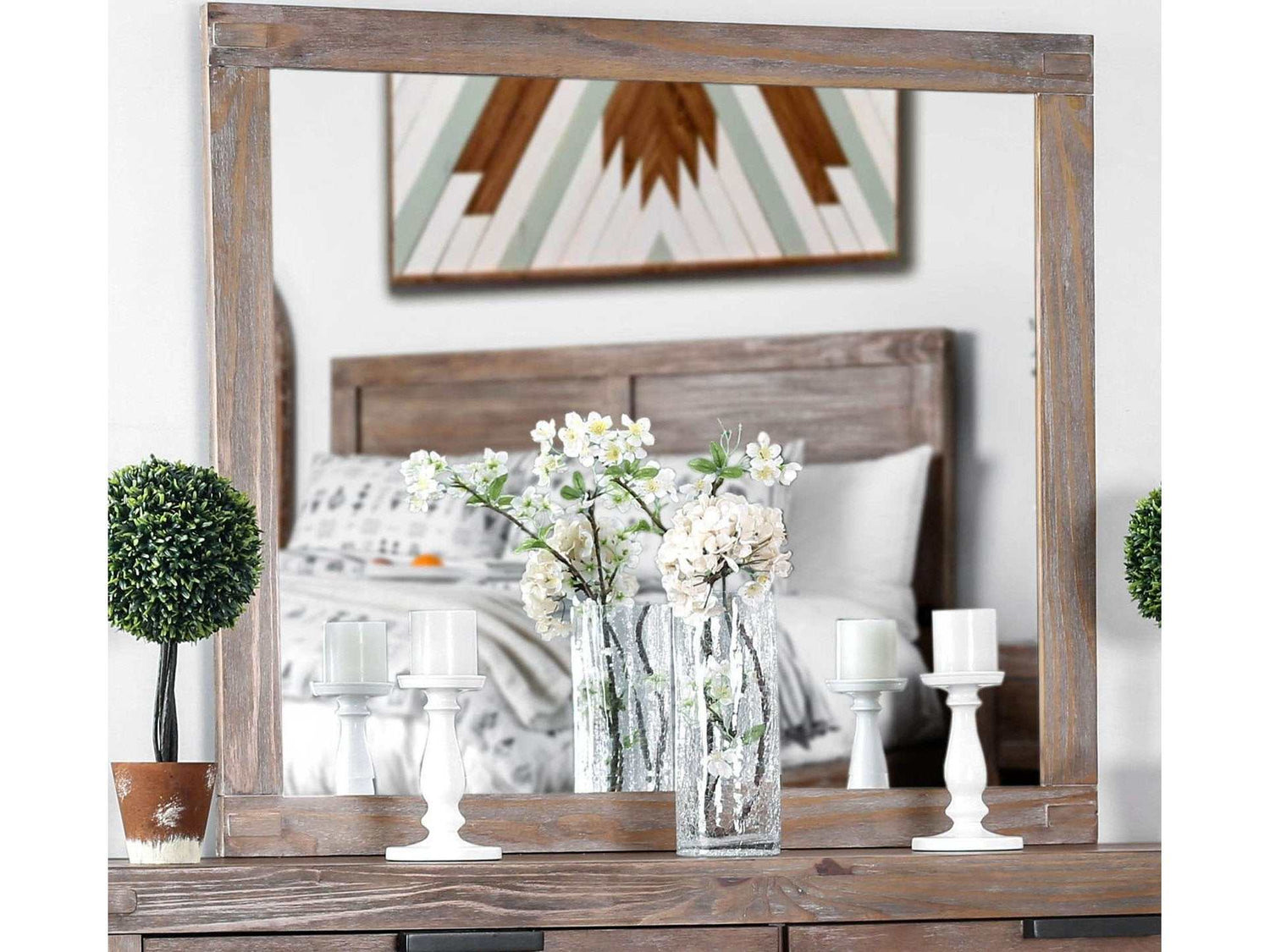 This weathered light oak finished mirror frame is a perfect complement to a bedroom set up.