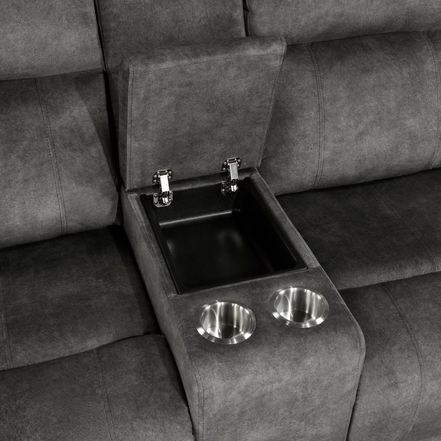 The Yates Collection pairs subtle modern lines with classic comfort, creating a seating group perfect for your casual living room. The dual ends of the love seat are engaged with a pull of the side mounted tab, taking your seated experience to the next level of comfort. Dark brownish-gray textured microfiber covers the collection lending soft touch and decorative versatility. The love seat features a console with dual cupholders and hidden storage.