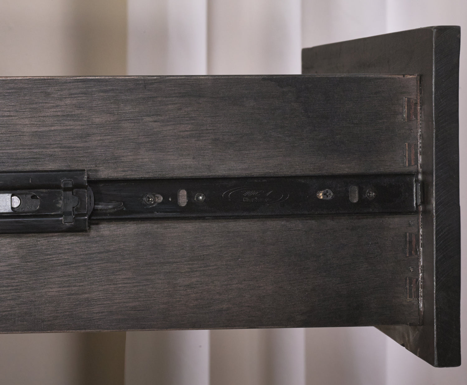 - Sanded & stained solid wood drawer boxes with front and rear English dovetail joinery for maximum rigidity and lasting quality; dust cover under bottom drawer; Full extension, ball bearing drawer slides for smooth, efficient operation and ample weight capacity