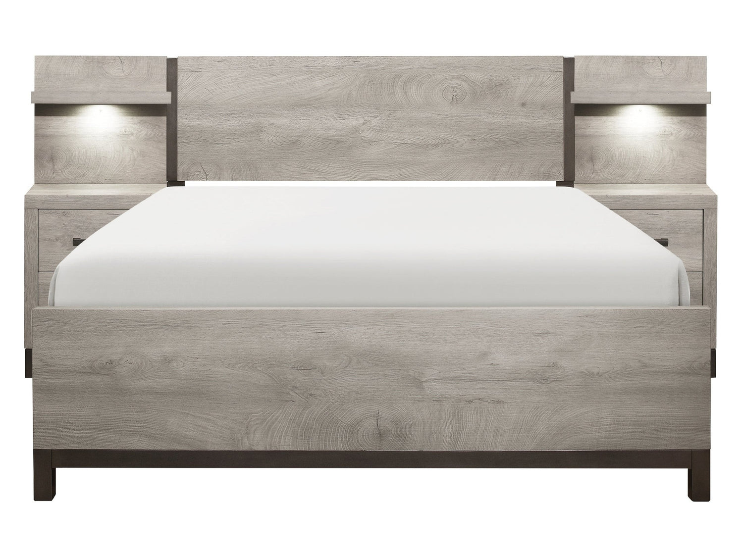 The sleek design of the Zephyr Collection pairs clean lines with modern convenience to create a style that will be the perfect palette for your design aspirations. The collection’s nightstands flank the California King low-profile panel bed, creating a wall-paralleling seamless transition between the pieces. Visually tying the collection together are the painted metal-finish banding of the headboard’s sides, as well as the footboard and case piece’s base rails, and along with the metal bar hardware of the nightstands, culminates in an accenting contrast to the gray faux wood finish of the melamine veneer.
