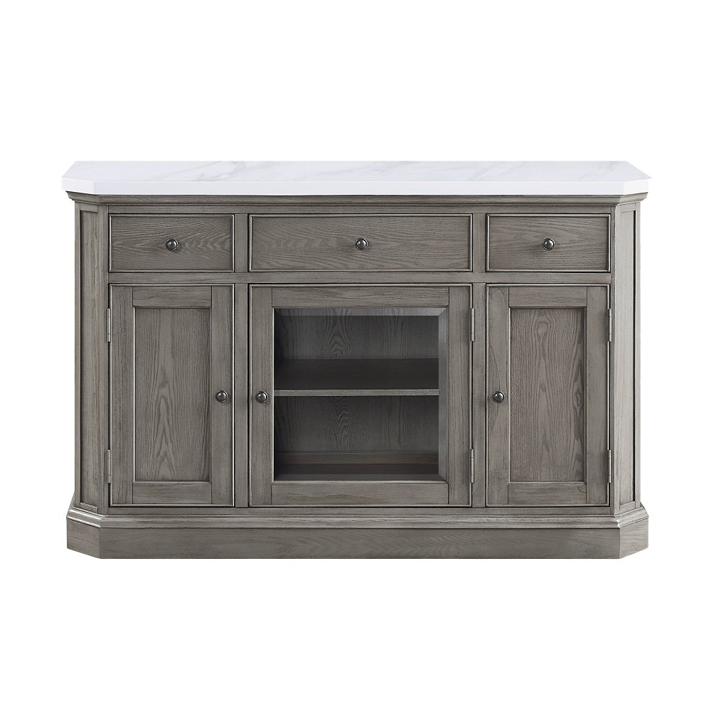 Serving a practical purpose while maintaining a classic design, the server features a gracefully carved wooden base in a weathered oak finish for rich textures and vintage beauty. White artificial marble top provides a clean and perfect counter space that is spacious enough to allow you to serve food or display delicate dishware. Three drawers under tabletop give your easy-access storage spaces for items often used, with two closed doors and a central glass door on the bottom for extra display and storage spaces.