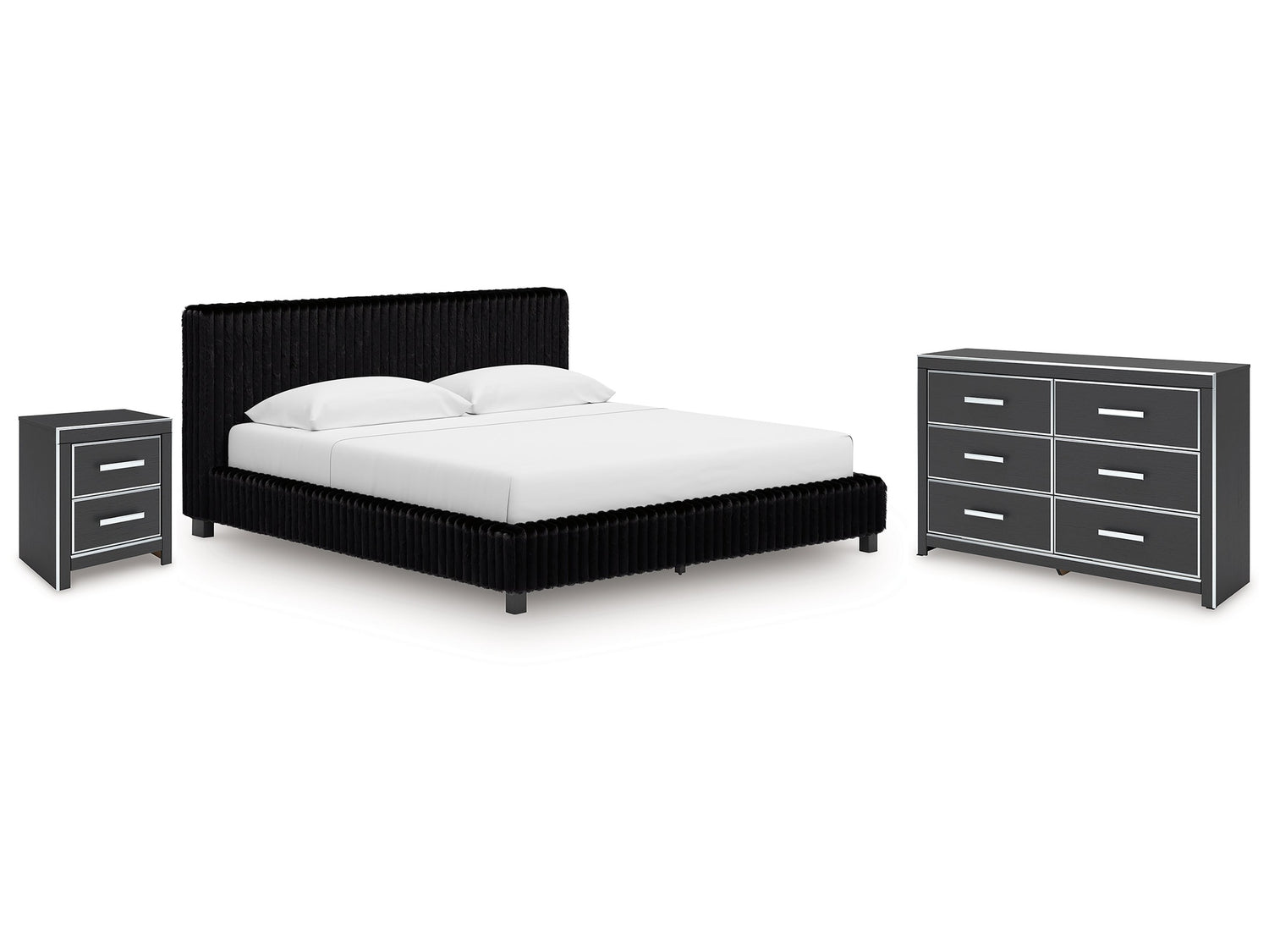 Zuraleus Black King Upholstered Bed, Dresser and Nightstand